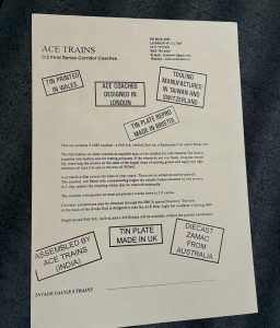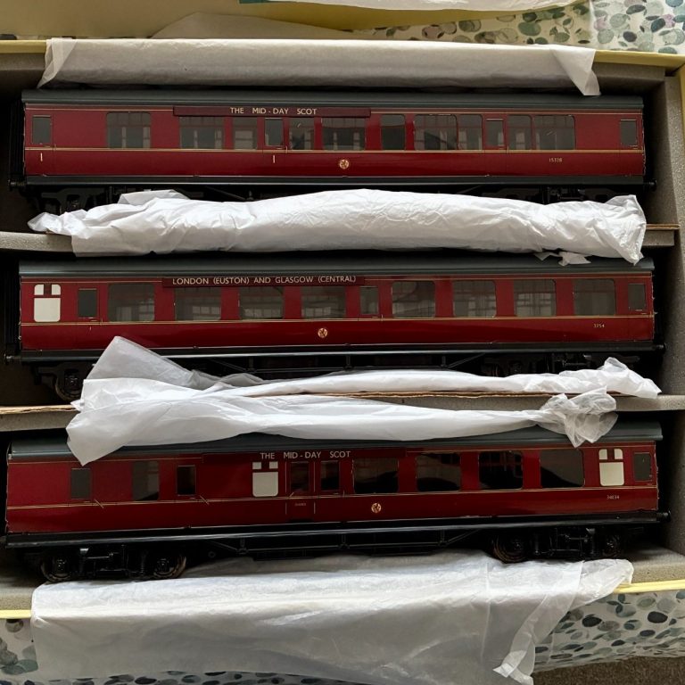 Ace Trains C/13 BR (M) Corridor Composite 15328, Brake 2nd 34134 and Open 2nd 3754 all in excellent/near mint condition having been stored in tissue paper for many years. Price £250.00