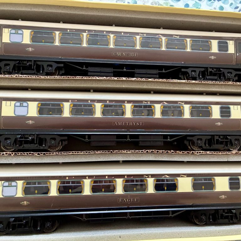 Ace Trains C/14 BR Pullman Mk1 Set A - Consisting of Parlour 1st Amethyst, Kitchen First Eagle and Parlour 2nd No 351 all in excellent/near mint condition. White Roofs. £275.00