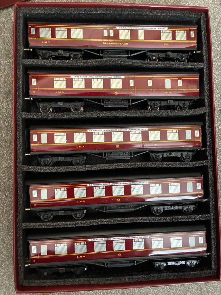 ACE Trains C-2 Set A LMS Merseyside Express Coaches. All 5 are in superb condition, all parts present. Coaches consist of Maroon Composite 4195, Maroon all 3rd 4195, Restaurant Car 4799, Maroon all 1st 4183 and Maroon Brake 3rd 26133