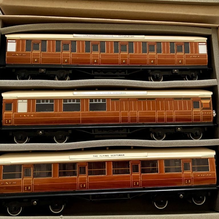 Ace Trains C/4 LNER Teak Set Flying Scotsman Black Windows 6461 All Brake 1st, 61639 all 3rd and 1516 Brake 3rd. In excellent/near mint condition. Price £250.00