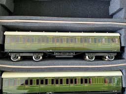These coaches are in excellent/near mint condition, these coaches are suitable for 3 rail use, they all have working interior lights, there are 3 x all 3rd class, 1 x 1st class and 1 x 3rd class brake coach, the boxes are also in excellent condition. This is a lovely set of five coaches. They come in their original boxes, also in superb condition and the green outer box. A lovely example.