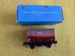 Hornby Dublo Meat Van Wagon D1 - The harder to find LMS version of the Meat Wagon. Item is in very good cosmetic condition and boxed. Cosmetically both wagon and box show usual signs of use. The box is good but with usual minor scuffing to corners and end flaps.