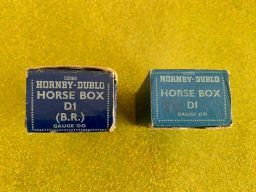 Hornby Cattle 2 off Horse Box D1 B.R. - plain dark blue boxes. Cosmetically one wagon is excellent condition and the other I would class as fair condition as it has a few scratches to side and roof. The boxes are both good just with the usual scuffs to the edges. Dated 1952 and 1953