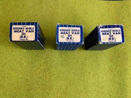 Hornby Dublo Meat Van B.R. D1 S50494 - Items description is 2 of the wagons in excellent condition both cosmetically and the boxes. The third wagon as can be seen has pitting and discolouration to the roof but the box is again in very good condition. Cosmetically both wagon and box show signs of use. The boxes are good but with usual minor scuffing to corners and end flaps. Price is for all THREE wagons.