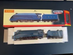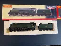 Hornby R2805XS Herring Gull A4 Loco - we acquired this from the estate and collection of someone who never got a chance to run this loco. Its classed as near mint in box and is a superb example. DCC and sound is fitted to this loco. This looks like it has never been out of its box ( except to photograph) however it did have a tiny bit of damage to a tender rail when it was posted out which has been repaired and though you cant tell the adjusted price reflects this. Runs really well both forwards and in reverse and sound also works well. (G)