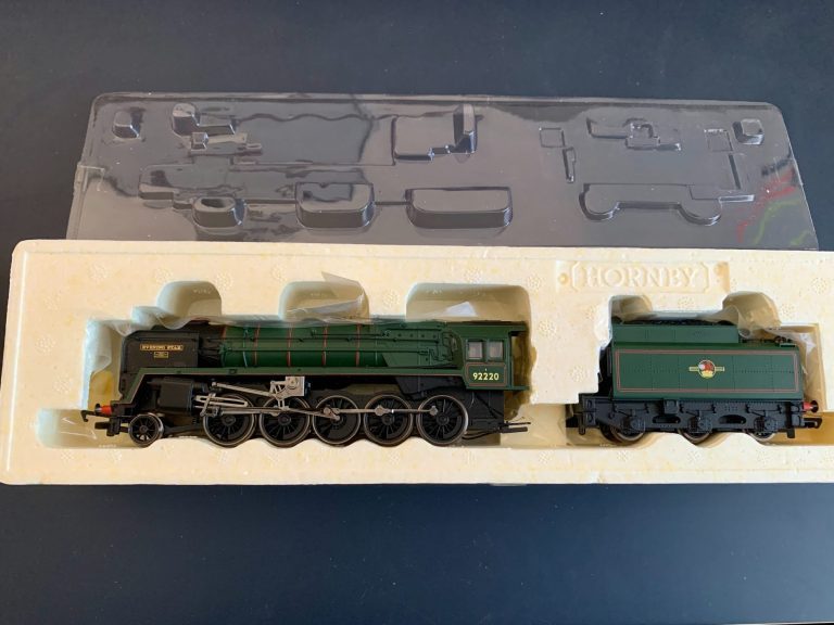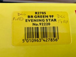Hornby R2785 BR Green 9F Evening Star - we acquired this from the estate and collection of someone who never got a chance to run this loco. Its near mint in box and is a superb example. DCC is fitted to this loco. This looks like it has never been out of its box ( except to photograph) (G)