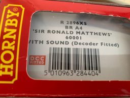 Hornby R2896 XS Sir Ronald Mathews A4 Loco - we acquired this from the estate and collection of someone who never got a chance to run this loco. Its classed as mint in box and is a superb example. DCC and sound is fitted to this loco. This looks like it has never been out of its box ( except to photograph) (G)