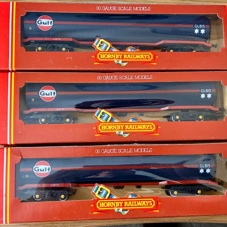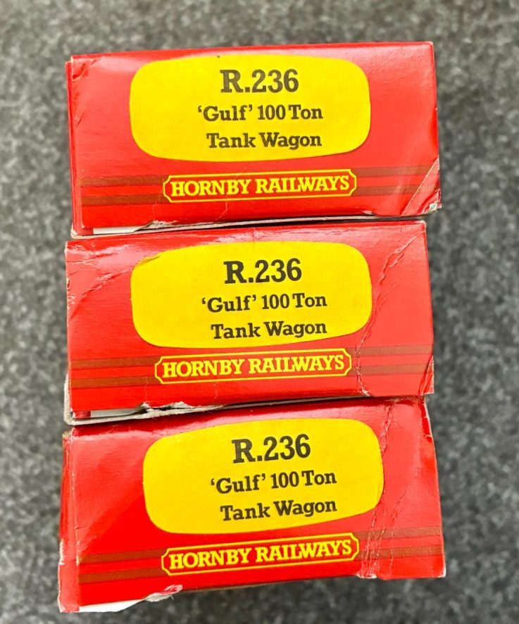 Excellent condition contents and box Hornby R236 Gulf 100 Ton Tank Wagon x 3 off. Priced at £25.00 each or £65 for all 3 off wagons.
