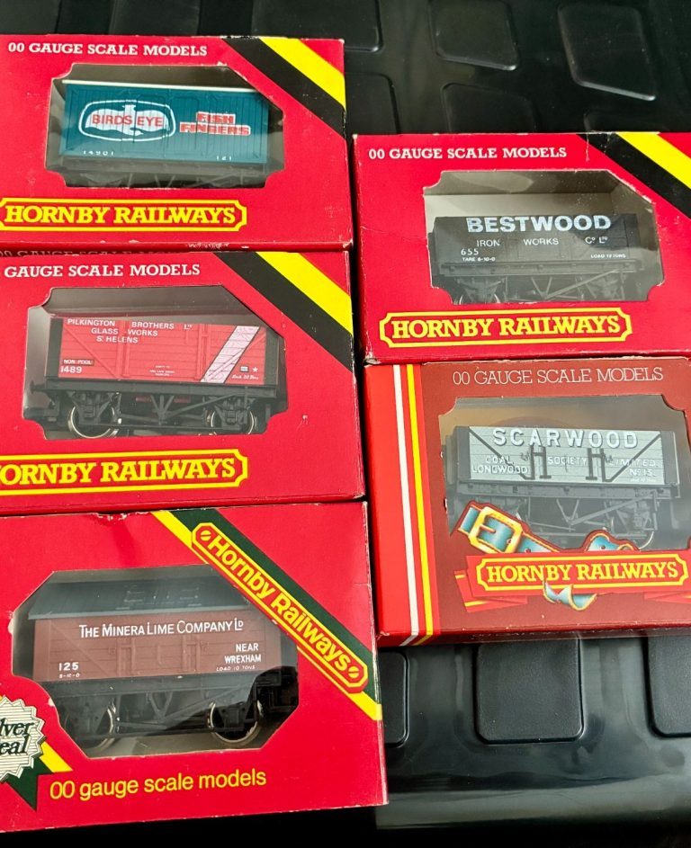 Hornby wagons all mint/near mint. R105 Birds Eye Closed Van, R096 Bestwood 5 Plank, R716 Scarwood 5 Plank, R211 Minerva Lime Wagon and R094 Pilkington Wagon. Price is for all FIVE wagons.