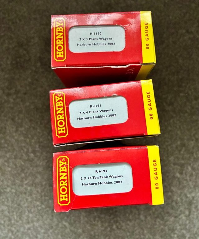 Hornby Harburn Hobbies 2002 2 x 4 Plank Wagons R6191, 2 x 3 Plank Wagons R6190 and 2 x 14 Ton Tank Wagons R6193