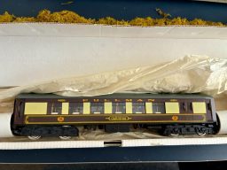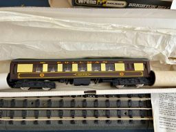 This Wrenn loco in Pullman Chocolate/Cream set with WHITE tables comes with its instructions, and all packing materials.Only 759 sets were produced with the white tables in Chocolate & Cream livery. looks like it has hardly been run except for testing. Packing number 61042 on both boxes. Its been in storage for many many years and although it runs its lumpy and could do with a service. Probably not been run for 30 years. Coaches are in near mint condition, while box is probably excellent condition. Coach numbers 90 and 91.